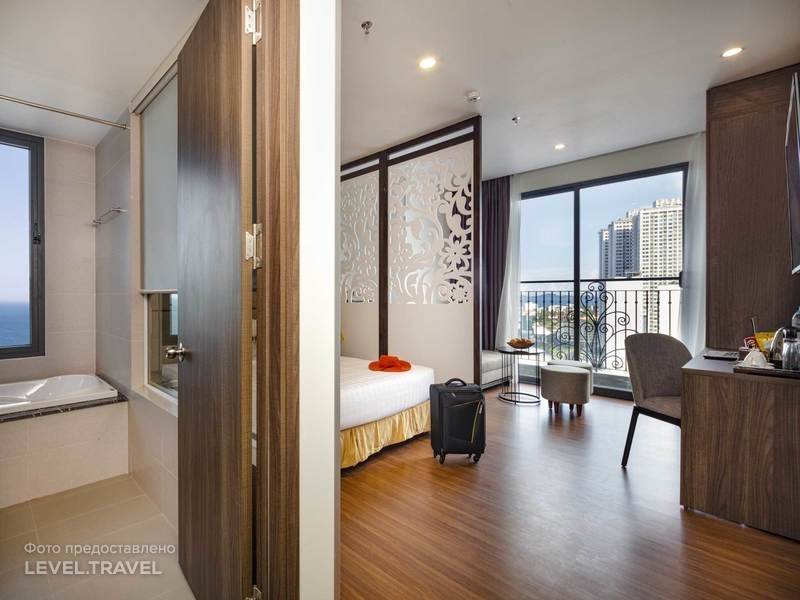 Номера просторные. Одна кровать 1 спальная, другая 1,5. Номер брали с Видом на море. Однако больших преимуществ он не даёт- впереди будет большой отель. Слева и справа есть море)) в номере минибар платный. Добавляют по 2 бутылки воды 0,35 л. Приветственная корзина фруктов смешная) и та которую пришлось выпрашивать. Завтраки на уровне: суп, яичница, 4 вида фруктов, рыбные, мясные шарики, лапша, рис, 3 вида колбас (невкусных), 3 вида пирожных, чай, кофе, 3 сока. Ресторан большой. Обед и ужин тоже возможен, но цены будут высокими. Отель на самом деле не на 1й линии. Идти недалеко до пляжа, но и там придётся пройти, напротив отеля пляжа нет. На пляже очищают от водорослей. И даже есть 5 зонтов, которые надо занимать в 6 утра. Это конечно насмешка какая-то. Платные лежаки обойдутся в 600 р (2 лежака и зонт). Море приятное, есть волны. Есть много кафешек. Однако многие закрыты,т.к. попали в их новый год. Самая вкусная и недорогая у Нины. Понравилась кафешка Красное солнце и Мон виет. Много кафе, где подают борщи. Но ехать в Азию, чтобы есть привычные блюда - это порно. Обед, ужин на двоих обходится в 600-900 рублей. Брали и лягушек, крокодила, страуса, креветок, устриц, кальмаров. Вкусные коктейли из свежих манго и прочих фруктов. Кафе не на туристической линии не очень манят своей привлекательностью. Поэтому советы уходить подальше не поддерживаю. Читайте отзывы на гугле. Персонал отеля хочет услужить всячески. Уборка посредственная, как-то попросили убраться - тогда все хорошо убрали. Спа в отеле дорогой. Лучше сходить через дорогу. Бассейн на 20 этаже небольшой. Не сижу смысла ходить туда, если море рядом. Отель близок к общественному транспорту. Однако ходит он до 17.30. Шум от близлежащий церкви по ночам не будил. Слышимость в номерах в пределах нормы.Да, очень вкусный кофе добавляют в номер каждый день. Полотенца пляжные можно взять, но опять же они заканчиваются быстро, поэтому надо поспешить.