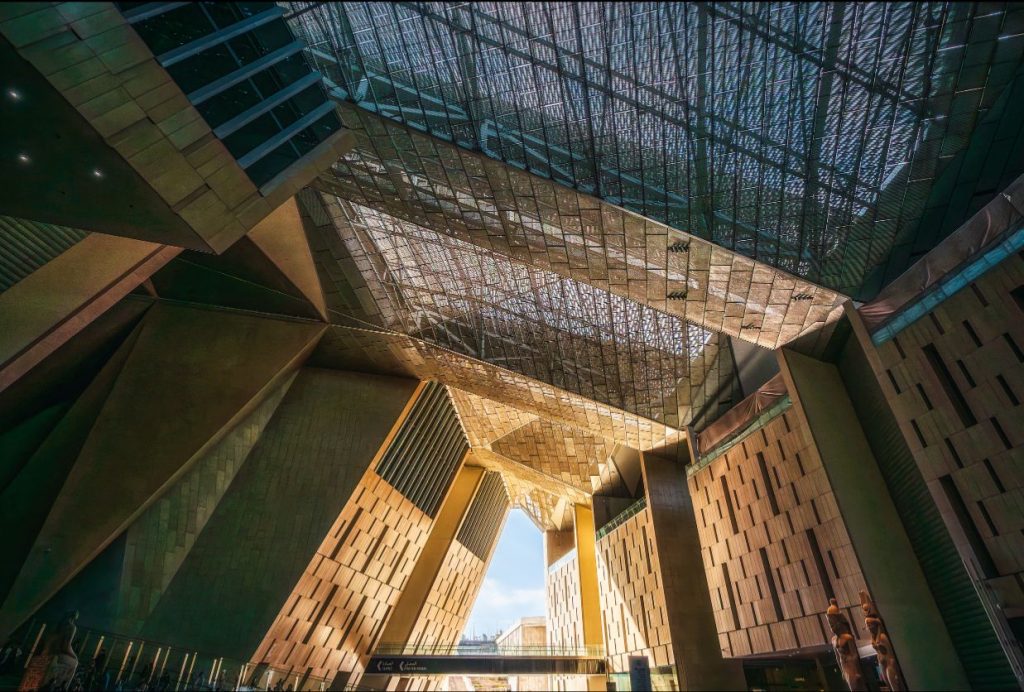 Треугольная форма здания перекликается с пирамидами Гизы на фоне. Фасад выложен местным алебастром с треугольными проемами, которые меняются от дня к ночи, создавая игру света и тени. Его называют “симфонией камня и света”. Три визуальные оси делят музей на отдельные зоны, каждая из которых ведет вас через определенный период египетской истории.